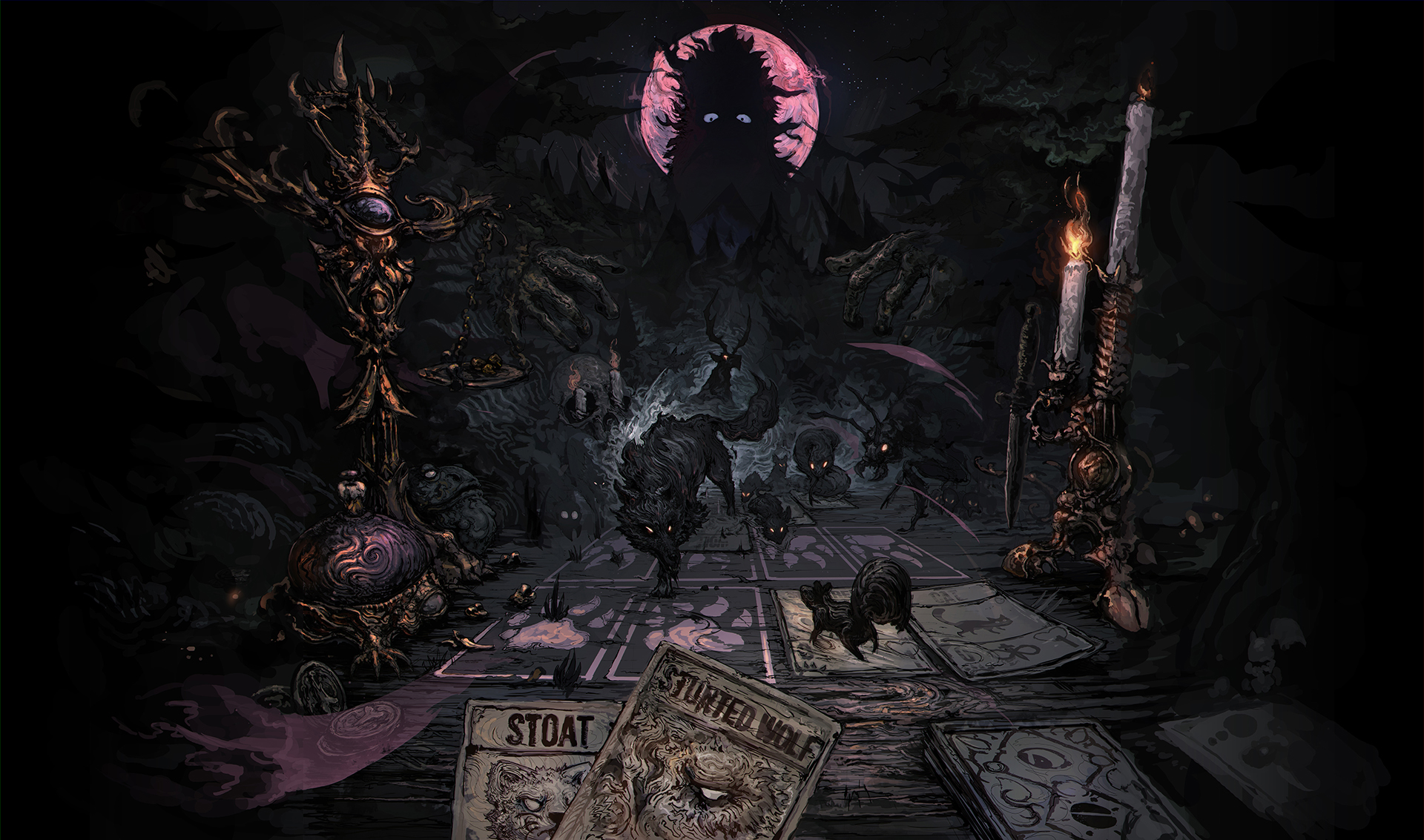 Inscryption inizia come un qualsiasi roguelike, ma la pulce all’orecchio la fa arrivare già il semplice fatto che non c’è un tasto di New Game, ma solo l’opzione di continuare la partita. Continuando la partita ci troviamo di fronte a un tavolo, un mazzo di carte e uno sfidante misterioso. L’atmosfera è quella opprimente delle case nei boschi dei film horror, l’ambiente è sporco, ci viene richiesto di farci del male per avere dei perk, le carte ci parlano e il sangue, ottenibile sacrificando carte-animali è l’equivalente “delle terre” della situazione. Ci muoviamo su una mappa, selezionando se la prossima casella sarà uno scontro, un negozio, o qualche altra situazione che in perfetto stile roguelike potrebbe facilitarci l’avventura o rendercela più difficile. Senza suggerimenti se non quelli che ci danno alcune carte parlanti.