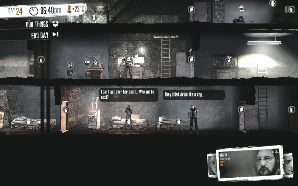 Lo scopo di 11 bit studios e della stessa scrittura di Setlak è quello di avvicinare i videogiochi alla realtà, trasportare giocatrici e giocatori non in mondi di fantasia in cui sentirsi invincibili, ma in contesti veri, crudi, tremendamente concreti. Ecco quindi che in This War of Mine non si gioisce per avere ucciso qualcuno e aver preso le sue provviste, ma si resta col senso di colpa per molto tempo, grazie all’immediata immersione ed empatia nel e col mondo di gioco.