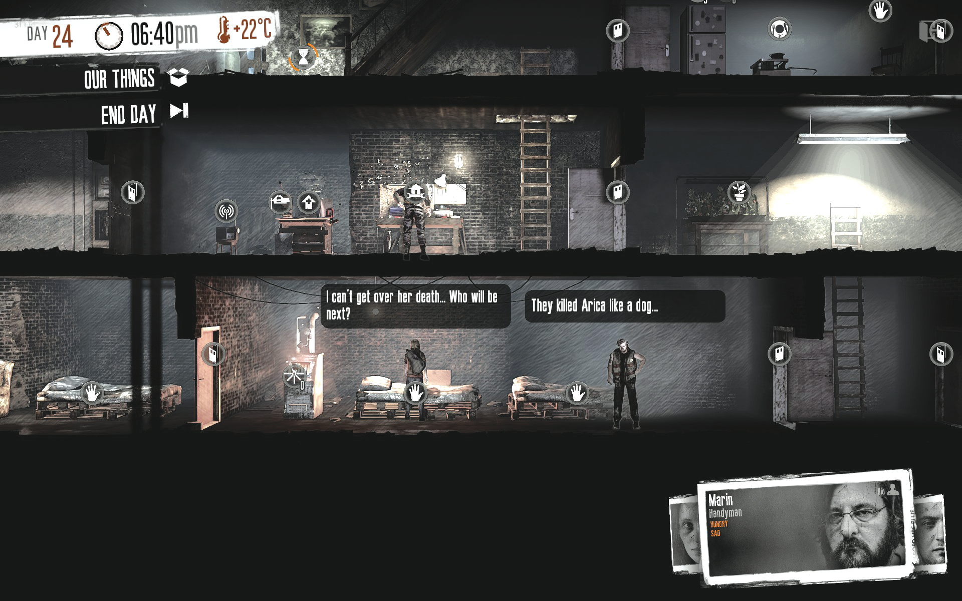 This War of Mine ce lo ricorda spesso tramite i murales, i veloci scambi di dialogo tra i personaggi, i loro diari. Da persona comune, sopravvivere ai cecchini appostati sui tetti, alle intemperie, alle malattie, alla fame e agli assalti di altri disperati non è semplice, anzi, non è detto che riesca. Dipende molto anche dai compromessi che si è disposti ad accettare pur di sopravvivere. Fino a quando poi? Finirà mai la guerra? Le meccaniche di This War of Mine funzionano in modo tale da far rivivere in chi gioca queste sensazioni di incertezza, oppressione e disagio.