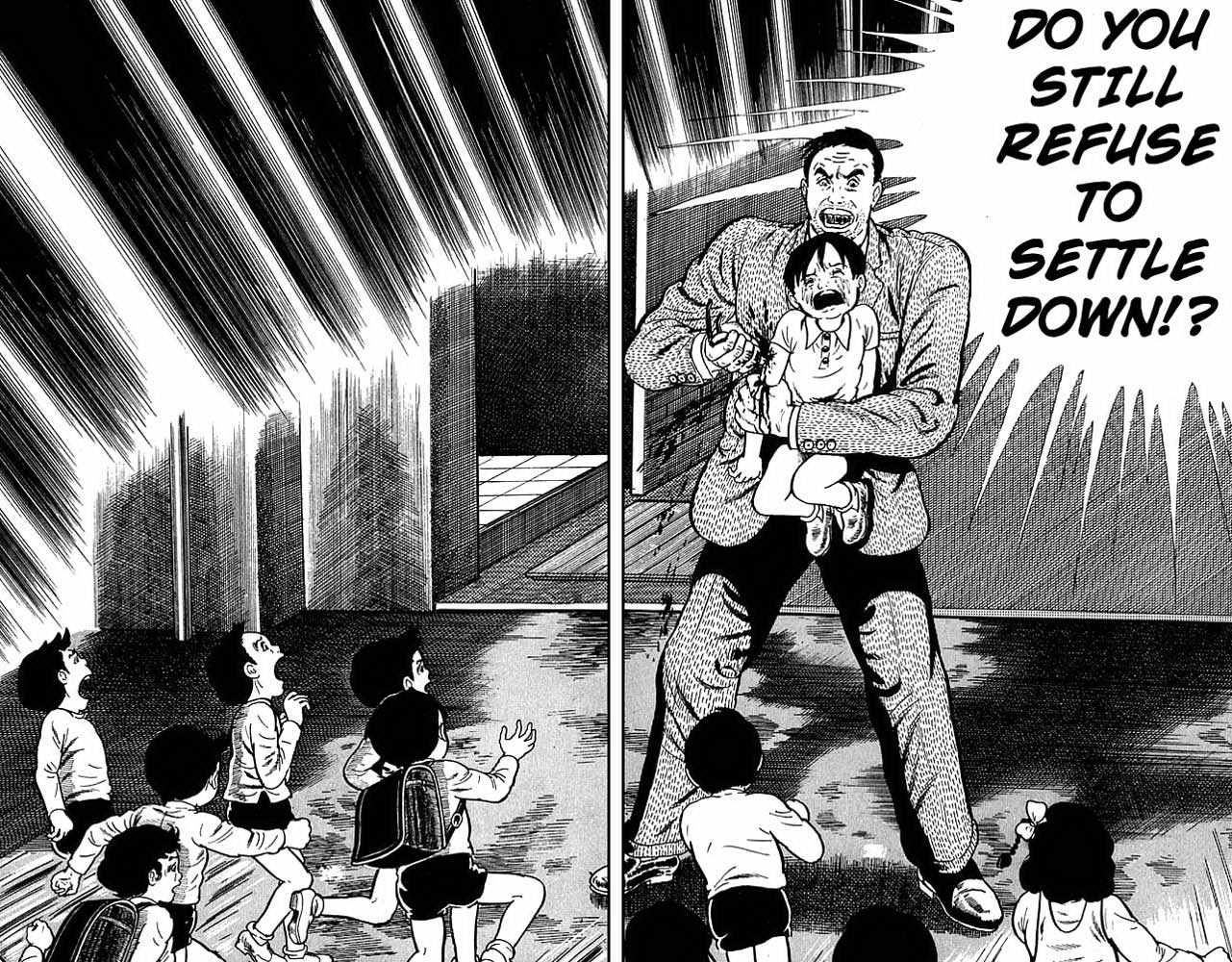 Al contrario, nelle opere di Umezu nessuno è al sicuro, e la schiacciante prestanza fisica degli adulti non lascia spazio ai più piccoli per rinegoziare i rapporti di forza: sia grandi che piccini devono quindi ricorrere agli stessi espedienti per farsi valere, spesso venendo meno agli obblighi imposti dalla loro età o ruolo sociale. Pensiamo per esempio al personale scolastico di Aula alla deriva (Hyōryū kyōshitsu, 1972-1974, vincitore del Premio Shōgakukan a fine serializzazione), che ancor prima di elaborare una soluzione per risolvere l’incidente – il loro istituto sembra essere stato catapultato in una zona desertica – si lascia andare ad aggressioni e furti ai danni di alunni e colleghi.