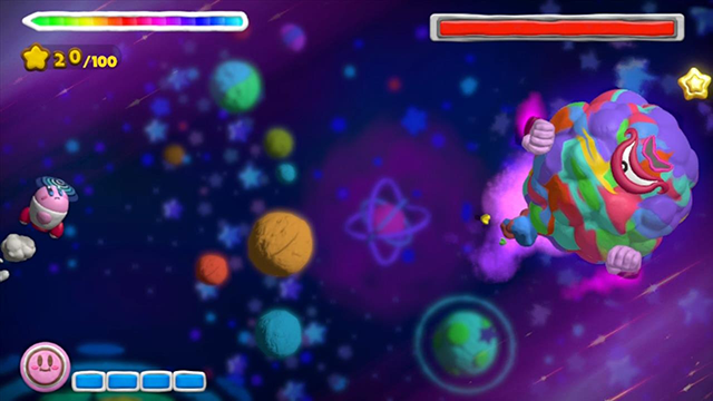Kirby rotola: ma dove può andare? Beh, praticamente ovunque per lo schermo, basta che ci sia una piattaforma che lo sorregga. E qui entra in gioco sempre il vostro fido pennino, con il suo corredo di poteri. Infatti disegnando sullo schermo potrete creare delle strade che sembrano delle piccole trecce colorate di plastilina su cui il buon Kirby può rotolare liberamente. È l’accoppiata pennello magico e rotolata che permette al nostro protagonista di raggiungere i luoghi più remoti dei livelli per sbloccare segreti e trovare aree bonus, raccogliendo le stelle, la vera valuta del gioco. Inoltre, ogni 100 stelline raccolte si attiva il potere super distruttivo del Kirby Missile, che permette di far viaggiare il nostro eroe a velocità siderali, distruggendo tutto quello che incontra sul suo cammino. Questa arma è poi fondamentale nei combattimenti contro i vari boss…