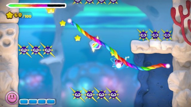 Certo, alcune cose ci hanno lasciati perplessi: le trasformazioni di Kirby, che da sempre hanno caratterizzato questo personaggio sono qui ridotte a solo tre: il carro armato, il sottomarino e il missile. Ognuna delle tre ha le sue peculiarità, con le relative alterazioni del gameplay: ad esempio il sottomarino (che è tra i più strani dei tre) spara missili che seguono i binari tracciati dal pennello, mentre si muove per i fatti suoi una volta indicatagli la destinazione da raggiungere. Quindi in questo caso il multitasking richiesto al giocatore rende queste sessioni di gioco molto più interessanti. Purtroppo queste trasformazioni sono tutte scriptate, previste dai livelli e non attivabili liberamente nel bel mezzo del gioco, non aggiungono quindi profondità al gameplay in senso lato, ma semplicemente alterano una formula già avviata per renderla diversa e creare una frattura tra i livelli. Ce ne dispiace, perché, aggiungere dei pezzi di livello raggiungibili solo se trasformati e permettere al giocatore di acquisire la possibilità di farlo liberamente, avrebbe dato adito a nuove soluzioni di level design e una più complessa struttura dei quadri stessi.