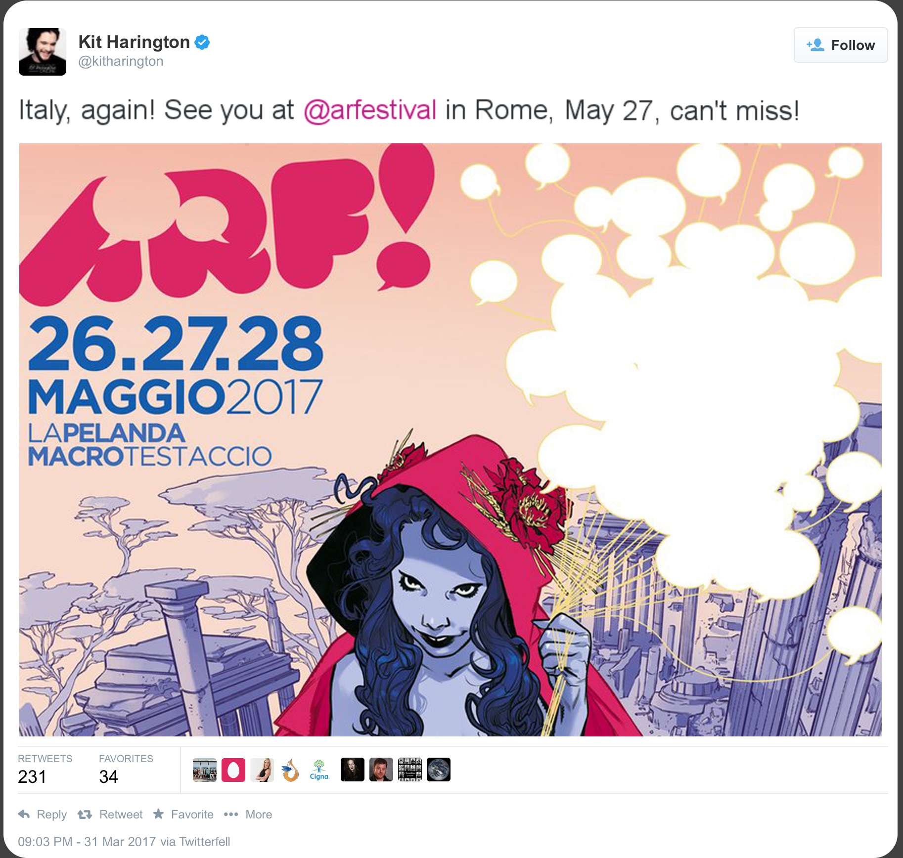 Per Harington si tratta della seconda volta in Italia in poco meno di un anno, dopo la partecipazione al festival del cinema di Venezia nel 2016, dove presentò Brimstone, nel cui cast figurano anche Dakota Fanning (The Neon Demon) e proprio quella stessa Carice Van Houten, che ne Il Trono di Spade interpreta la sacerdotessa rossa Melisandre. La presenza dell’attore va ad impreziosire il parterre degli ospiti di ARF! Festival, il festival del fumetto che, alla sua terza edizione, promette di veder sfilare nella splendida cornice del MACRO di Testaccio alcuni tra i più grandi nomi dell’intrattenimento nazionale e, ora, mondiale.