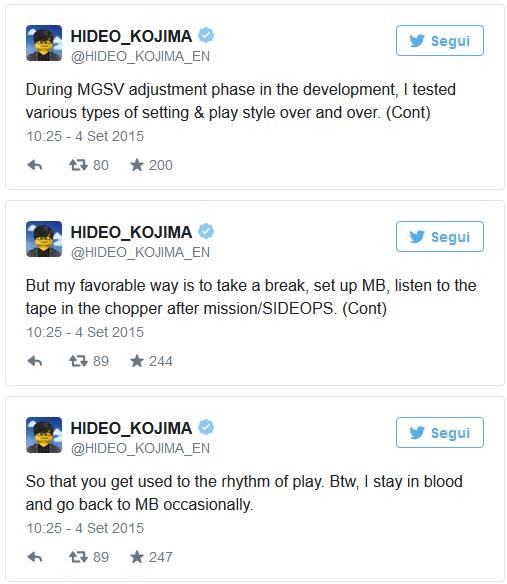 Hideo Kojima ha dedicato qualche tweet ai suoi fan, regalandogli alcuni consigli su come trarre il massimo dall’esperienza di gioco di Metal Gear Solid V: The Phantom Pain.