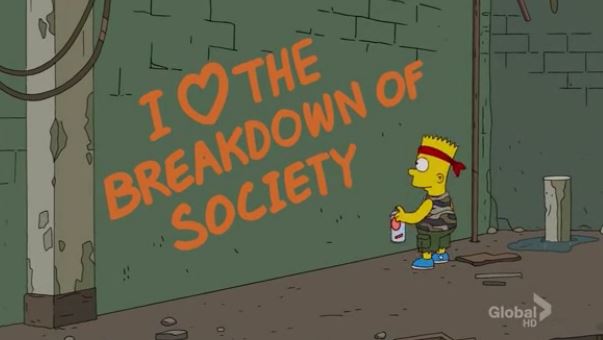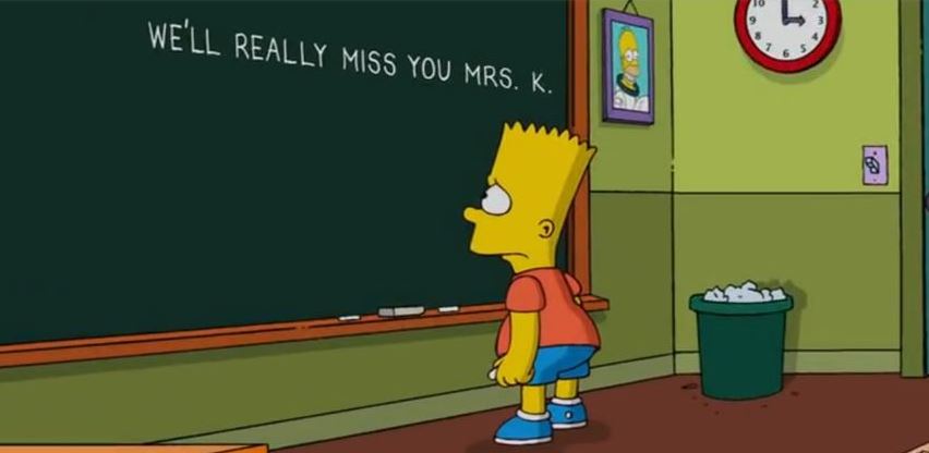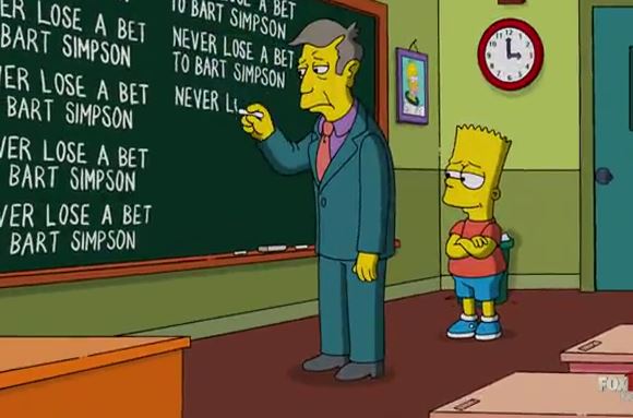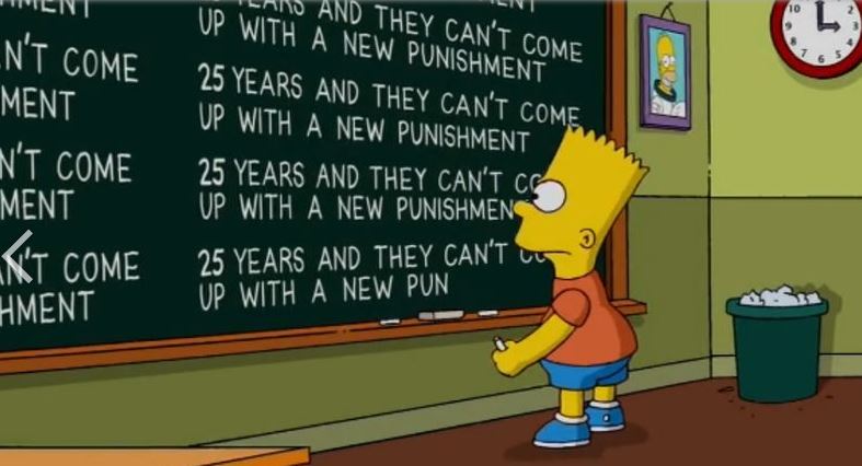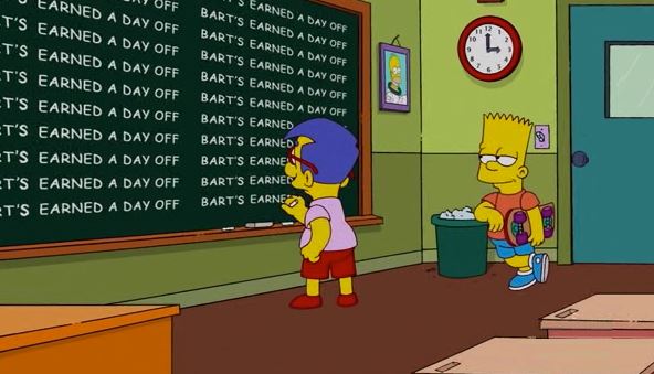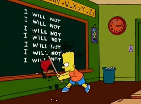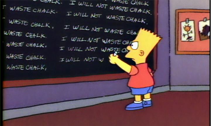 Tutta l’esasperazione di Bart Simpson (e probabilmente dei suoi sceneggiatori) esplode al trecentoduesimo episodio dello show, quando Bart durante l’ennesima punizione, sfascia l’odiata lavagna e corre via ridendo istericamente.