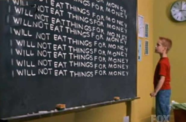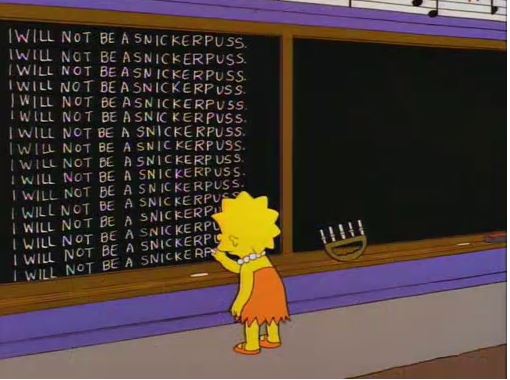 Ancora una volta non c’è Bart a scrivere la punizione. “Non pagherò mia sorella per eseguire la punizione al posto mio”. Lisa esegue la punizione al posto di Bart. Non fa una piega, no?