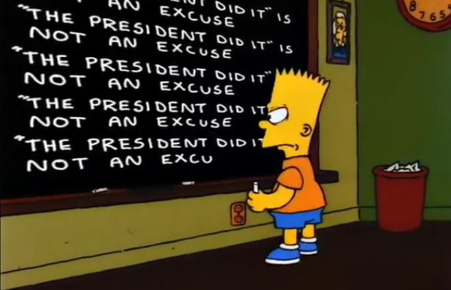 Avete presente quei meme che circolano in Rete sulle varie predizioni del futuro dei Simpson che poi si sono avverate? Bene, anche gli sceneggiatori, a quanto pare, che in questa chalkboard gag probabilmente compiono il loro capolavoro. Come abbiamo già visto, nessuno è immune al bersaglio dei Simpson, tantomeno i politici, figurarsi il Presidente degli Stati Uniti. Succede dunque che nella puntata “Bart al futuro” (s11e07) Lisa Simpson, che nella visione di Bart diventa la prima presidentessa donna degli USA, fa capire di aver trovato un buco nel bilancio lasciato dall’amministrazione precedente, nello specifico dal “Presidente Trump”.