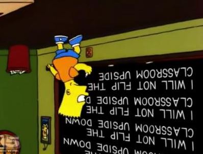 La quarta parete si fa sempre più sottile in questa gag, dove Bart, per l’appunto, capovolge l’intera aula, lavagna compresa.