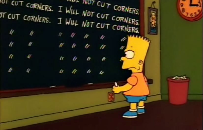 Bart scrive alla lavagna ciò che è traducibile con “Non cercherò scorciatoie” per l’appunto… trovando una scorciatoia. La frase è infatti scritta un paio di volte, e poi il pestifero Bart fa il furbo utilizzando le virgolette ed evitando di ripeterla fino alla fine della lavagna come di consueto.
