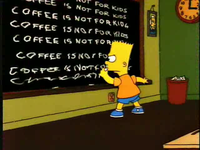 Extra dose di caffeina per Bart, che, supereccitato, scrive alla lavagna in preda ai tremori. No, il caffè non fa per lui, decisamente.