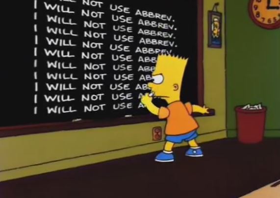 Un po’ come nella gag in cui Bart non avrebbe cercato scorciatoie, il pargolo di casa Simpson la fa franca ancora una volta, abbreviando la parola “abbreviazioni”.