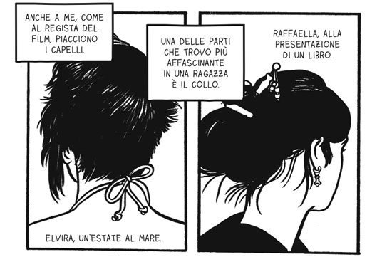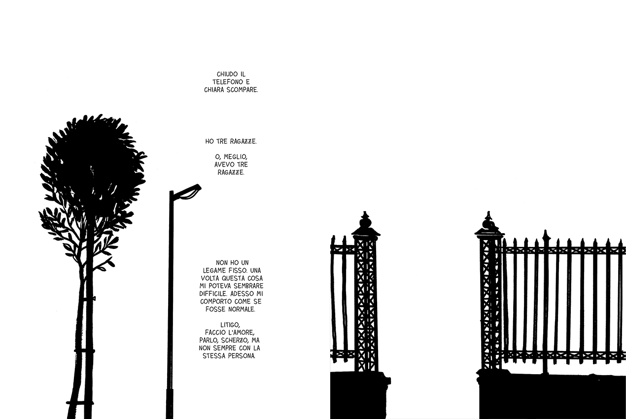 Eh già, perché Le Ragazze è come un discorso, riguardante tutt’al più avventure e lezioni amorose di una persona, e come discorso è frammentario, diacronico, a volte vago, altre dettagliato, sincopato, liquido, eppure, anzi proprio per questo, estremamente vero. Nell’intervista che abbiamo tenuto con l’autore, ci ha parlato di quanto prediliga raccontare storie nel loro stato atomico, quando tutti gli elementi sono lì ma devono ancora essere uniti per formare un senso definito, un’interpretazione. Le Ragazze, così come anche Come Svanire Completamente (di cui moltissimi chiedono a gran voce la ristampa), è un esempio perfetto di questo particolare metodo, e funziona: siete testimoni di alcuni episodi della vita del protagonista, orbitanti prima attorno al suo io, al suo desiderio egoista e, come Baronciani stesso afferma, quasi “antipatico” di avere e amare, e sempre più, poi, attorno alla sua paura del cambiamento, al desiderio più nascosto e reale di essere amato.