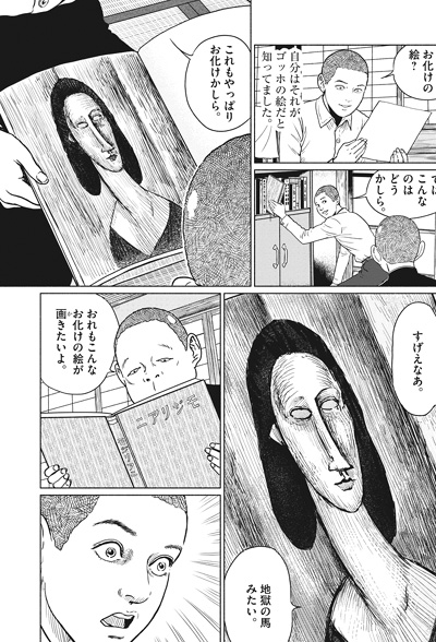 Inoltre, l’impatto visivo risulta ancor più straordinario grazie all’abilità di inserire omaggi ad artisti come Vincent Van Gogh, Francisco Goya e Amedeo Modigliani. Gli elementi di arte moderna europea (che Ito aveva già dimostrato di conoscere e apprezzare, ad esempio, con la rivisitazione del celebre Urlo di Munch utilizzata come copertina per la raccolta Fragments of horror) non stonano assolutamente, ma si fondono in maniera armoniosa al disegno in stile manga e alle rappresentazioni grottesche dei demoni e degli spettri che affollano la mente del giovane Yōzō.