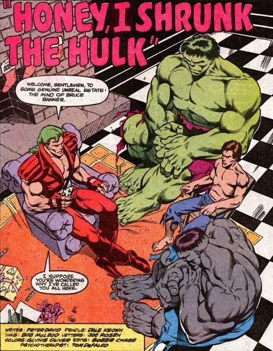 Gli anni Ottanta e gli anni Novanta segnarono un profondo cambiamento nell’atteggiamento verso la malattia mentale nei supereroi. Si arrivò anche a mostrare in maniera esplicita la psicanalisi sulle pagine del fumetto, come nel caso di Hulk, sottoposto a una terapia d’urto da parte di Doc Samson per rimettere insieme i frammenti della sua personalità. Uno dei momenti che rese grande la gestione del Gigante di Giada di Peter Allen David.
