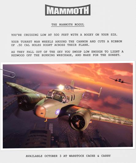 “A partire da oggi, a solcare i cieli di Southern San Andreas c’è anche il Mammoth Mogul, una potenza a doppia propulsione dotata di torretta calibro .50 e mitragliatrici frontali, progettata per trasformare i velivoli nemici in groviera. E con i potenziamenti su cui può contare, come il Decollo assistito da propulsore a reazione (JATO) e un vano bombe adatto ad accogliere bombe esplosive, incendiarie, a gas e a grappolo, esercitare la supremazia aerea non è mai stato così gustoso. Ordina subito il tuo Mammoth Mogul, in esclusiva da Warstock Cache & Carry.“