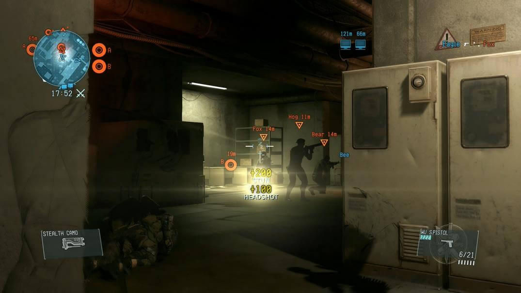 Agire nell’ombra completamente soli infatti, con tot compagni che fanno la stessa cosa invece che coprirti, rende il raggiungimento dell’obiettivo piuttosto casuale e ostico, anche perché una volta che si viene scoperti è molto molto facile lasciarci le penne, sia perché non è possibile rispondere al fuoco adeguatamente sia perché si disattiva la mimetica ottica momentaneamente, scoprendoti al fuoco non solo di chi ti ha avvistato per primo ma di tutta la squadra nemica. Dall’altro lato della barricata, essere difensori e cercare di scoprire tra le fratte o gli angoli una silhouette trasparente non è cosi divertente… Sarebbe stato bello avere la possibilità di creare diverse trappole ma, per motivi che ancora non mi sono chiari fino in fondo, in questa modalità moltissimi gadget sono vietati. Insomma in Cloak and Dagger c’è poco da fare oltre che strisciare o aguzzare la vista, ma tutto sommato, è l’essenza più primordiale di Metal Gear perciò possiamo quanto meno trovarci un senso.