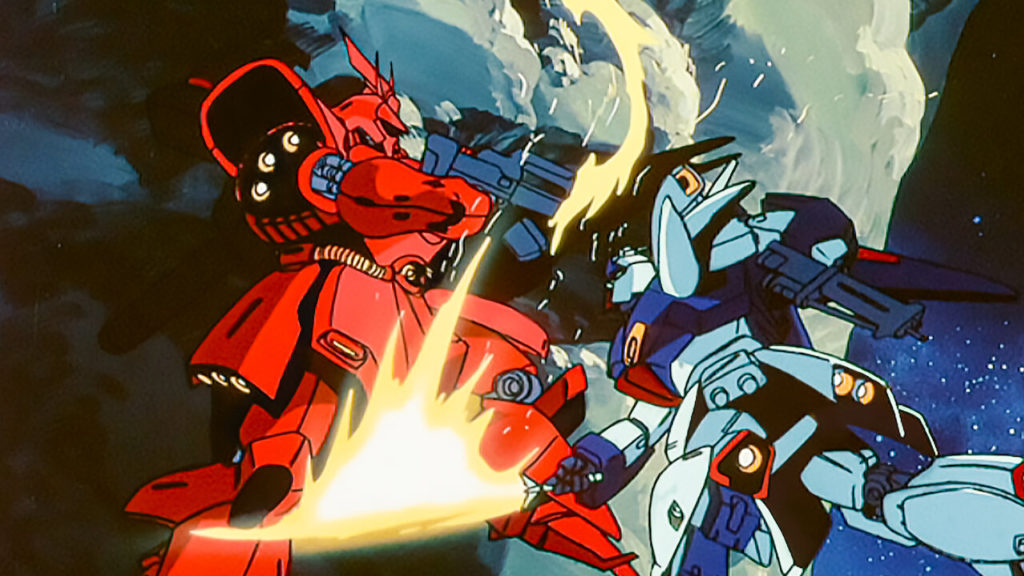 La pensano diversamente Amuro Ray – benché a sua volta un newtype – e gli altri membri della Londo Bell, la task force di mobile suit incaricata di intercettare le colonie in rotta di collisione prima dell’impatto, i quali puntano a eliminare la minaccia separatista e a favorire una graduale migrazione su base volontaria negli insediamenti già costruiti nel sistema solare. Nonostante gli sforzi dell’unità di Amuro, il primo colpo di Char va comunque a segno, con lo schianto dell’asteroide Luna 5 sulla sede del governo federale e l’uccisione dei suoi quadri dirigenti: negoziando una finta pace, il paladino di Zeon riesce a impossessarsi della colonia spaziale Axis, ripetendo poco dopo la medesima operazione con un attacco a sorpresa.