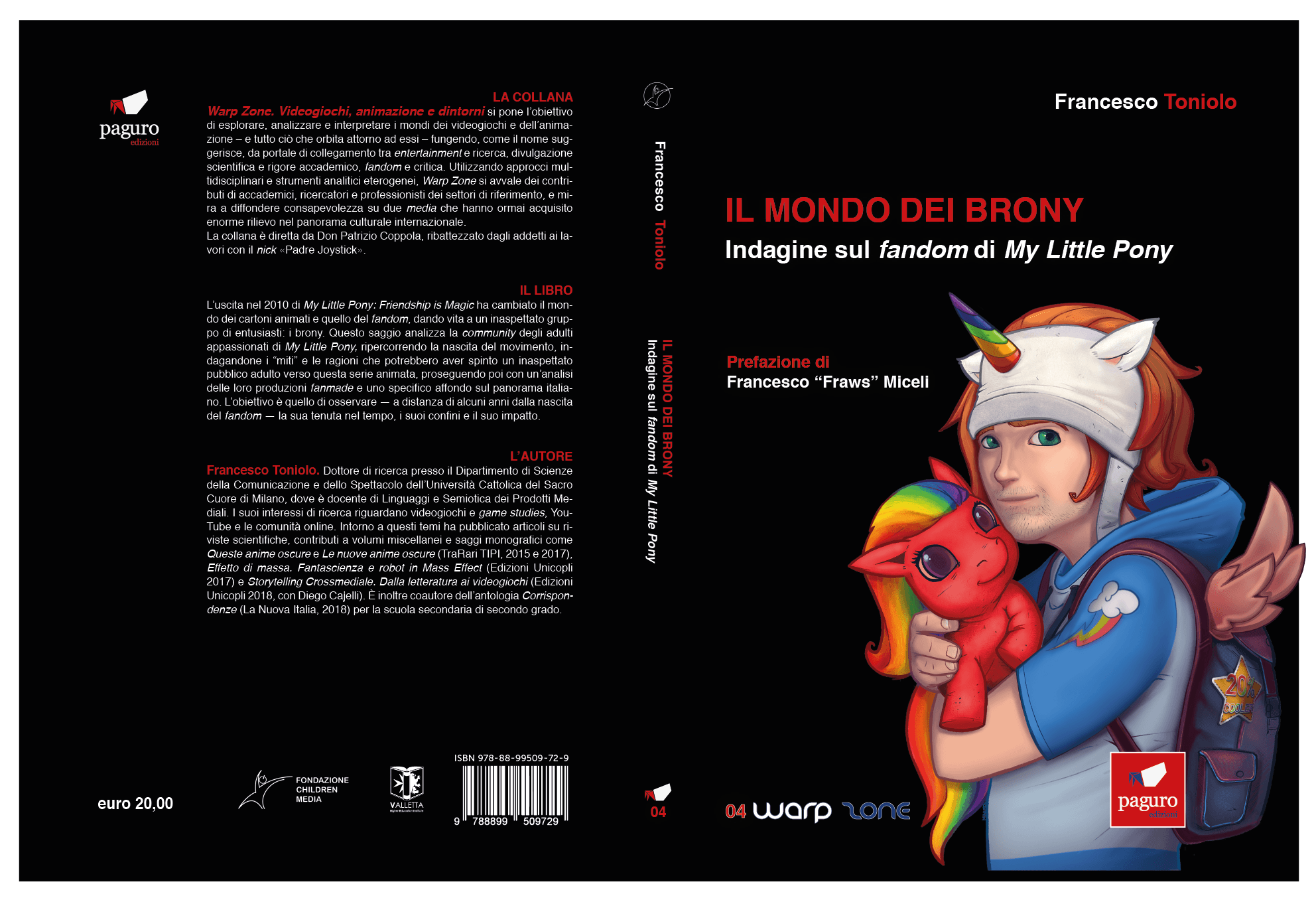 È da quest’input che nasce il libro “Il mondo dei brony. Indagine sul fandom di My Little Pony” di Francesco Toniolo, edito da Paguro Edizioni (2019). Un autore già noto in queste pagine, poiché proiettato principalmente sui videogiochi, che in questo caso va oltre, concentrandosi su un fenomeno che guarda anche al medium videoludico, ma che in generale riguarda la cultura pop nata nel web. Una ricerca rigorosa e attenta, suddivisa in sei capitoli, che ha come obiettivo quello di dare una spiegazione oggettiva sulla figura del brony, e sulle diverse declinazioni ed espressioni che hanno portato alla formazione di dicerie e luoghi comuni. Data la particolarità dell’argomento, abbiamo fatto una chiacchierata direttamente con Francesco per scoprire meglio i contenuti del volume e i retroscena legati alla sua analisi.