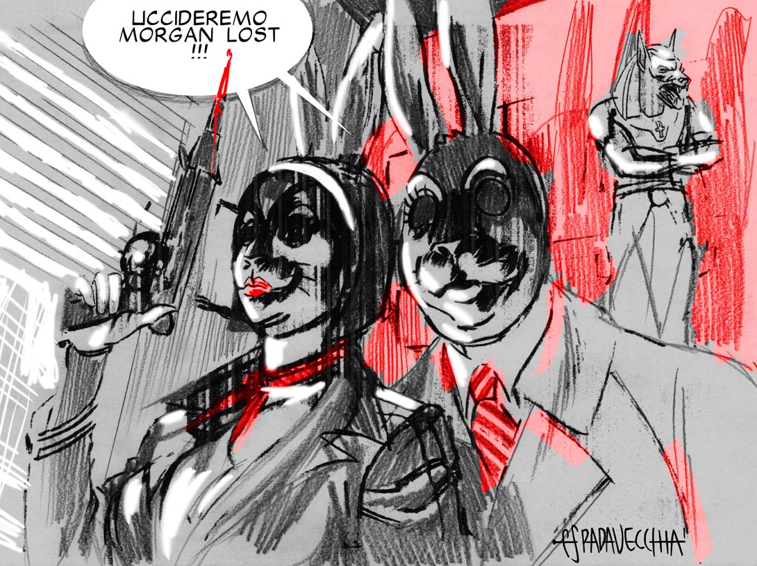 Questo, insieme all’ambizioso inseguimento dei due conigli divergenti di novità e tradizione, è forse l’unico rischio, e ribadisco rischio, non difetto, che l’opera corre allo stato attuale. Comparato con tutta la qualità che la serie esprime nel primo albo, che ci auguriamo continuerà ad esprimere, e con i suoi più che intriganti elementi di originalità, appare un rischio minuscolo e assolutamente valevole di essere corso da noi lettori. Almeno finché la situazione rimane quella attuale, cioè: storia appassionante, citazionismo enciclopedico e colpo di scena finale inaspettato (dal già citato Claudio Chiaverotti); disegni di qualità, perfettamente in linea con l’atmosfera (merito di Michele Rubini); colorazione di cui abbiamo già tessuto le lodi (il cui credito va ad Arancia Studio); copertina che salta subito all’occhio, energica e folle (opera di Fabrizio De Tommaso). Un action-thriller dalle tinte inquietanti, con un personaggio convincente e una spruzzata sanguinolenta di psicologia criminale, ecco cos’è Morgan Lost. E ci piace.