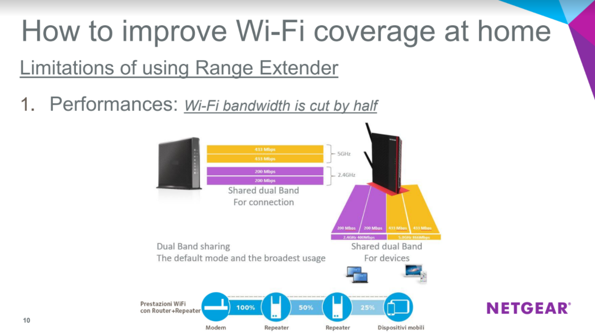 Il primo è sicuramente legato al posizionamento: se avete la necessità di raggiungere una parte dell’abitazione che il solo router non riesce a coprire, sarà fondamentale posizionare il Range Extender in un punto che gli consenta sia di “prelevare” il segnale dal router, che di raggiungere il luogo di riferimento. Da qui può essere evidenziato il secondo grande problema, che è quello relativo alla rete non unificata. Immaginate di aver posizionato i dispositivi come detto poco fa e di muovervi in casa con un tablet o uno smartphone. Quello che succederà, con un normale range extender, è che non vi collegherete a questo fin quando il segnale del router principale non sarà abbastanza debole da obbligarvi ad interrompere la connessione, collegandovi (ovviamente automaticamente) all’extender. Come è facile capire, la connessione che utilizzerete non sarà sempre di ottima qualità, per via del segnale che andrà man mano diminuendo fino a switchare la connessione sul dispositivo più vicino. Infine, l’ultimo importante limite degli extender è legato al numero di bande che, nei modelli più economici, è pari a 2. Un extender ha il compito di gestire sia la connessione verso il modem, sia quella verso il client (il vostro dispositivo) che, in parole povere, si traduce in un dimezzamento della banda che ovviamente verrà ulteriormente dimezzata aggiungendo un ulteriore extender.