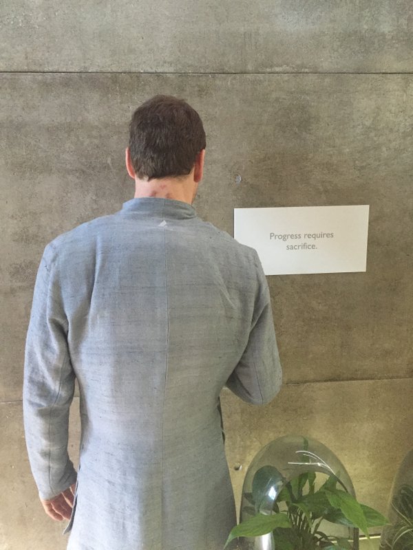 L’immagine raffigura l’attore, di schiena, con dei segni sul collo, vicino ad un cartello con la scritta “Il progresso richiede sacrificio”.