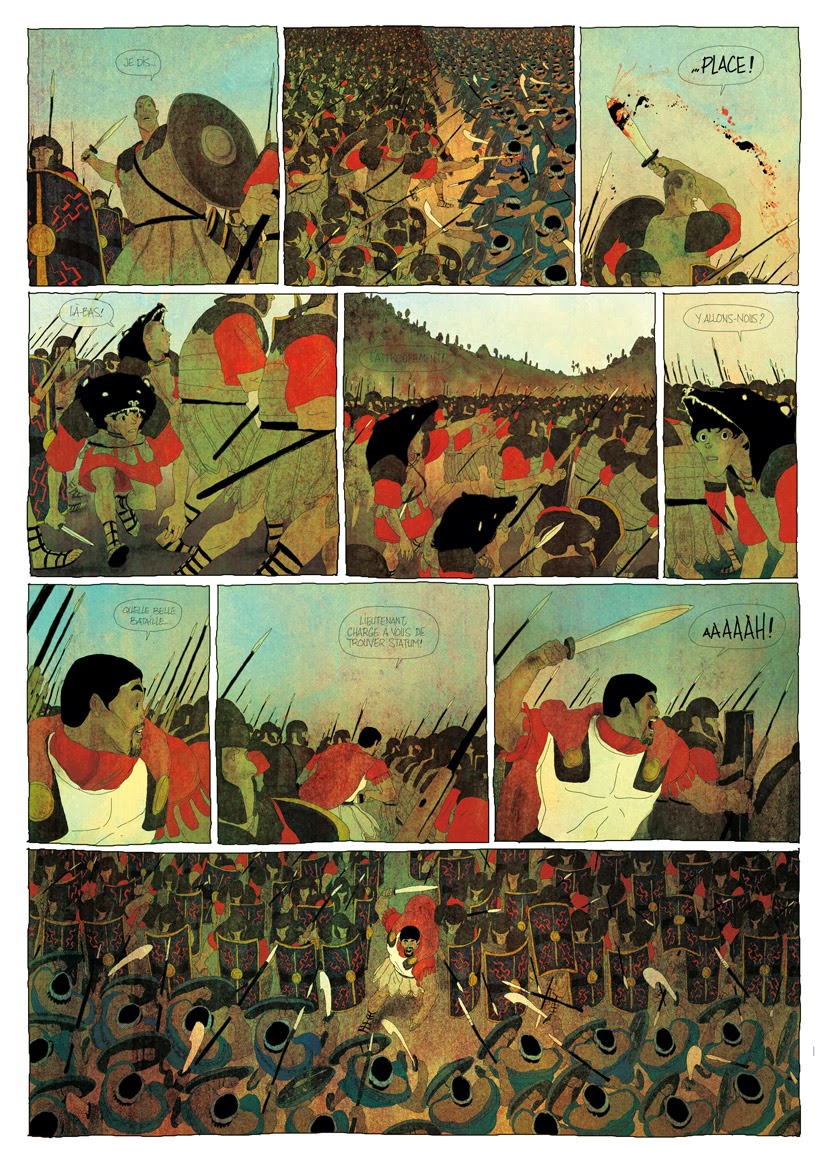 Dal punto di vista stilistico, il lavoro è stato disegnato a quattro mani da Marwan e Bastien Vivés e si vede. Del primo si nota subito l’inchiostrazione pesante con neri profondi e marcati, mentre dell’altro autore salta all’occhio lo stile essenziale, minimalista, fatto di poche righe e tratteggi nervosi. Le tavole sono ricche, piene di vignette come nella migliore tradizione francese e l’azione è ben orchestrata, con un’ottima gestione dei tempi narrativi. I dialoghi scorrono lisci e sono infarciti (almeno in sede di traduzione) da interiezioni epiche e antiche, che rendono quel giusto mood romano, che tanto ricorda i vecchi film fanta-storici che Hollywood ci ha regalato a metà del secolo scorso.