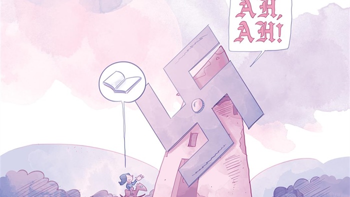 Sfruttando lo strategemma di manzoniana memoria del manoscritto ritrovato, Daniele Fabbri scrive una storia che, come intuibile, riprende il bestseller di Exupéry. Non solo nell’intento ma anche nella forma, dato che non si tratta di un graphic novel in senso tecnico quanto di un libro illustrato, come l’opera originale. Ma se nel racconto il viaggio del Piccolo Principe era il leitmotiv per elencare una serie di episodi illuminati da una morale, qui abbiamo un qualcosa di molto diverso. Ci troviamo infatti davanti a un giovane Führer in erba che vive tranquillo su un asteroide pieno di vulcani “perfetti per bruciare i libri di cattiva propaganda“, senza pensare troppo all’avvenire. Ma un giorno il nostro protagonista incontra una rosa vanitosa che promette di suicidarsi ad ogni frase e che ha paura dei “ratti“. Allora, il protagonista decide di partire per proteggere il suo fiore da questa terribile minaccia. Passando da un pianeta all’altro, incontra tante figure diverse che gli insegnano qualcosa di importante, consigli che il piccolo nazionalsocialista farà suoi per diventare un Grande Führer. Basta un poco di cultura generale e qualche pagina di lettura per capire che il percorso metaforico, intrapreso a suo tempo del Principe astrale di Exupèry, nel Piccolo Führer diventa un’allegoria del cammino che ha portato Hitler a guidare la Germania all’alba della Seconda Guerra Mondiale.