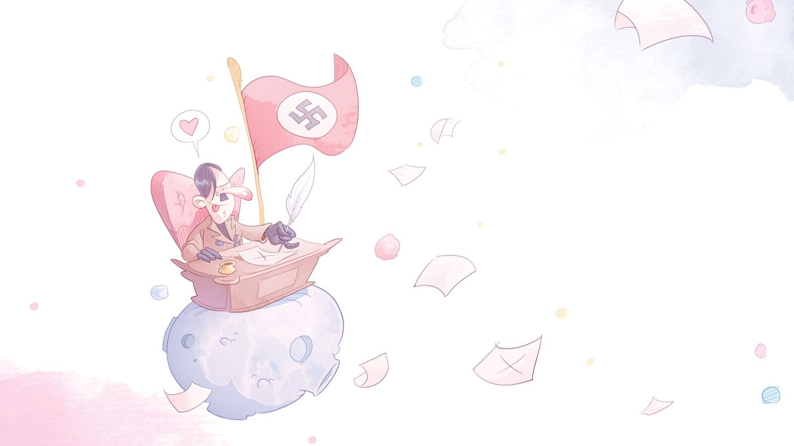 Alla fine, quello che Il Piccolo Führer fa è stimolare una riflessione attraverso contrasti forti, fortissimi, che vedono al centro la poetica dell’infanzia di Exupéry e quella del terrore di Hitler. Cosa che sarebbe stata impossibile senza gli acquarelli di Stefano Antonucci e Mario Perrotta, capaci di dare vita a dicotomie disturbanti, a metà tra dolcezza e orrore. Soprattutto, nella rappresentazione caricaturale dei personaggi storici e dei pianeti/stati, il disegnatore trova la sua massima espressione, realizzando delle illustrazioni che prendono letteralmente a cazzotti in faccia il lettore e approfondiscono il senso del testo. Impossibile non rimanere a bocca aperta, come presi da un malessere interiore, di fronte all’immagine di Anna Frank che dichiara di voler tentare di “istruire” i mulini a vento, nella speranza che l’unico modo di batterli sia insegnare loro l’amore. E lo fa raccontando una storia, aprendo un libro e leggendo a voce alta. Vuole farli riflettere, esattamente come fa la satira. Cerchiamo di tenercela stretta.