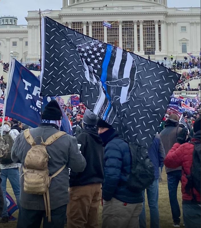 A far discutere questa volta non è l’uso del logo del movimento dei poliziotti, ma la sua presenza su alcuni dei manifestanti che hanno fatto irruzione nell’edificio del Congresso degli Stati Uniti. Qui di seguito potete vederne un’immagine circolata in questi giorni, divenuta tristemente famosa.