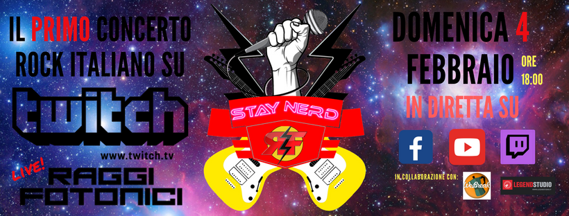 Stay Nerd e i Raggi Fotonici sono orgogliosi di annunciare la data del primo concerto online della storia del rock italiano. Non un’ospitata, non una strimpellata via YouTube, ma oltre un’ora di spettacolo con musica dal vivo, che saranno trasmessi live e gratuitamente, attraverso i canali Facebook e Twitch.tv di Stay Nerd e sul canale YouTube dei Raggi Fotonici, domenica 4 febbraio alle ore 18. Il concerto nasce da un’idea di Raffaele Giasi, Direttore di Stay Nerd, e Mirko Fabbreschi, leader dei Raggi Fotonici, che hanno unito le forze per la creazione di questo innovativo e promettente spettacolo musicale digitale.