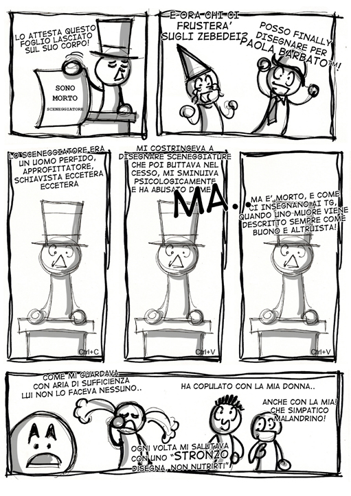 Sì, insomma, Je suis Chapeau è un po’ libro di parole, un po’ libro di fumetti. È un LIBRIDO, un essere raccontante costruito con pezzi di storie vecchie e nuove. Ricordiamo che tutto è introdotto dal pretesto della morte de Lo Perfido Sceneggiatore e che quello che abbiamo letto è il suo contribuo postumo alla causa dei fumettisti e dei webcomics. E intorno a questa vicenda si sviluppa il resto della storia, raccontata a fumetti, con flashback™, evoluzioni e colpi di scena.