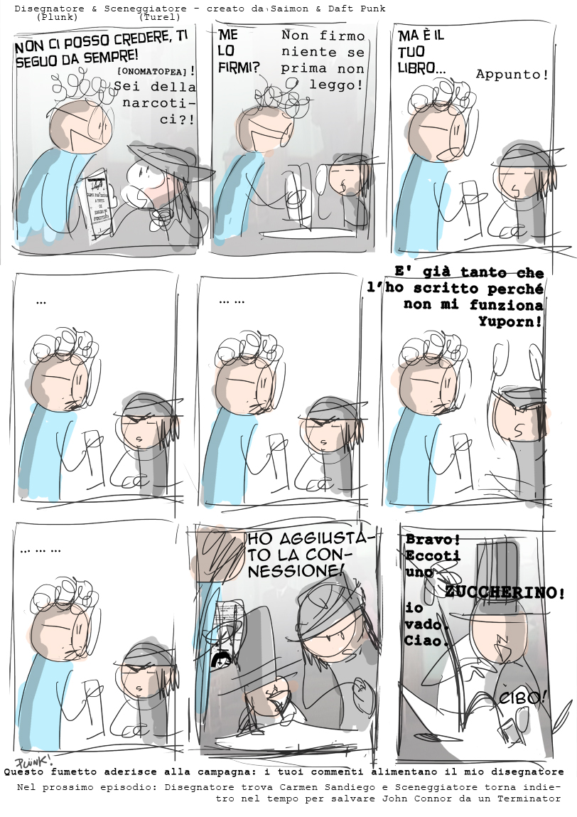 In questo frangente, Andrea Caccese si è avvalso della collaborazione di diverse personalità del webcomic e del fumetto indie italiano , autori come Plunk, Pierz, Vaz, Trepicomics, Davide La rosa, Studiopazzia, Lise e Talami, Condre, Spyro, Emiliano Mattioli, XDinky, Giro, Marco Giammetti e Drawdown. Tranne che in alcuni casi, la coerenza stilistica è evidente: siamo nell’ambito dei cosidetti ‘fumetti disegnati male’, una corrente artistica dove la (in)capacità dell’autore di disegnare le vignette non è un male e basta, ma un male necessario. In questo tipo di approccio artistico prevalgono gli omini stecco, i disegni pasticciati e le griglie storte, ma questo non è un difetto. Come direbbero gli utenti Mac: è una faeture! Disegnare male un fumetto non vuol dire fare un brutto fumetto, su questo non ci piove, e i lavori intorno al saggio di Turel ne sono un esempio lampante. Molte sono storie autoconclusive di una singola pagina, altre si dilungano per qualche tavola in più, ma tutte hanno un senso, sia nella loro singola esistenza, sia nell’economia narrativa dell’intera opera. Le trovate grafiche e gli spunti narrativi variano e si sovrappongono, a cominciare dai diversi font che riempiono i baloon dei vari personaggi, fino alla rottura della quarta parete, l’uso metafumetti e del nonsense più efferato, andando a creare un mix di stili unico e riconoscibile, dove l’elemento scritto diventa parte integrante del disegno e il disegno supporta la parola. Io sono un tifoso dei fumetti disegnati male, lo ammetto, ma non sono un prodotto di facile digestione: il disegno è considerato un aspetto troppo grande del mezzo di comunicazione, tanto che spesso vedere cose disegnate in maniera non elegante fa storcere il naso e fa partire automaticamente filippiche e critiche infinite… Come sempre la verità sta nel mezzo, nel senso che ci sono fumetti disegnati bene e scritti da fare schifo e ci sono fumetti disegnati male e scritti peggio. Quindi, l’unico consiglio che c’è da dare è questo: fermatevi e leggete e guardateli, tutti, questi fumetti!