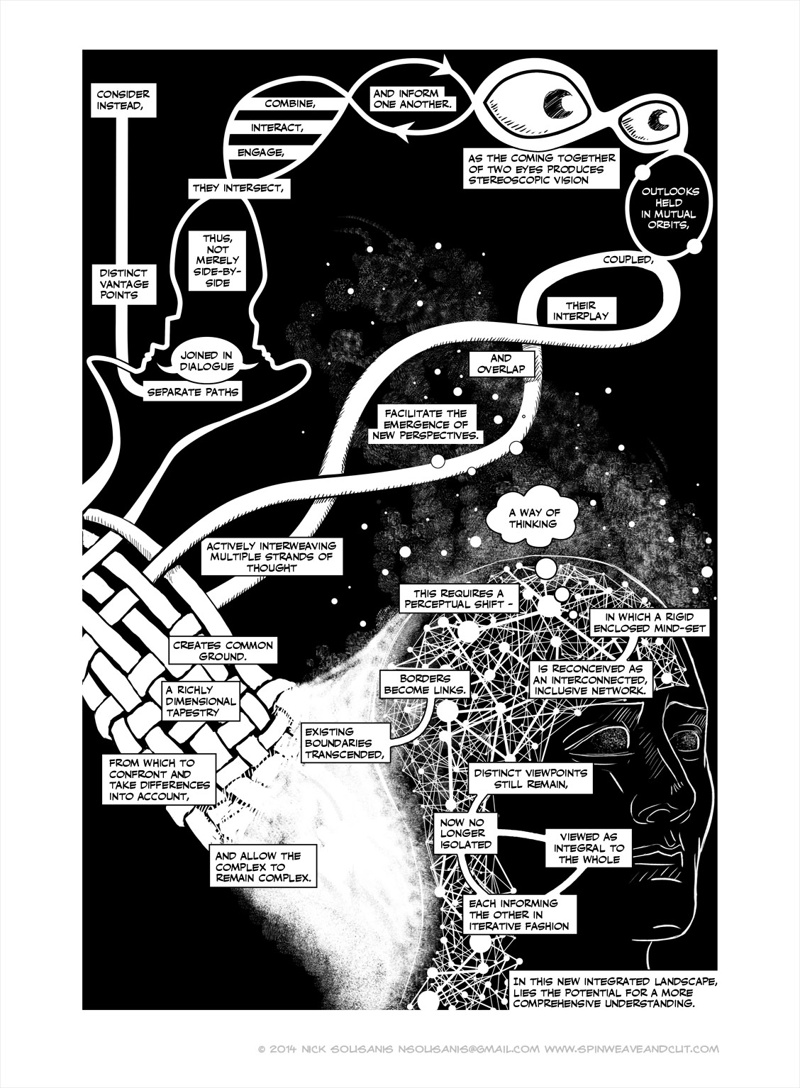 Una decisione che trae le sue radici dal sentire comunque della divisione tra mente e corpo, tra pensiero e sensi: “penso dunque sono”. Sousanis cerca dunque, in Unflattening, di rivalutare completamente l’aspetto visuale e, una volta che ha dimostrato la sua importanza al pari della parola, punta deciso ad elencare i punti di un manifesto programmatico che possa aprire le porte ad una sana simbiosi. In fondo, dice, se l’uomo pensa costantemente mettendo insieme le immagini che gli passano davanti agli occhi e le riflessioni testuali del pensiero, perché queste due forme non possono essere ugualmente importanti? Unite, anziché tenute separate? Perché fin dall’asilo veniamo educati a dare la priorità delle parole lasciando da parte il resto, mentre invece non dovremo limitarci a questo. Favorire l’aspetto verbale, infatti, è un po’ come vivere tenendo aperto l’occhio destro e mantenendo chiuse le palpebre del sinistro: ci rende ciechi a metà. Invece, tutto è collegato nella realtà oggettiva delle cose. Le parole coesistono con le immagini, mentre la maturata interattività visuale dell’epoca moderna (social, internet, videogiochi) spinge per intaccare la dittatura del testo in favore della vista. Una dittatura che dobbiamo a tutti i costi rovesciare se vogliamo sprigionare le potenzialità reali della nostra mente e imparare a pensare in maniera multidimensionale.
