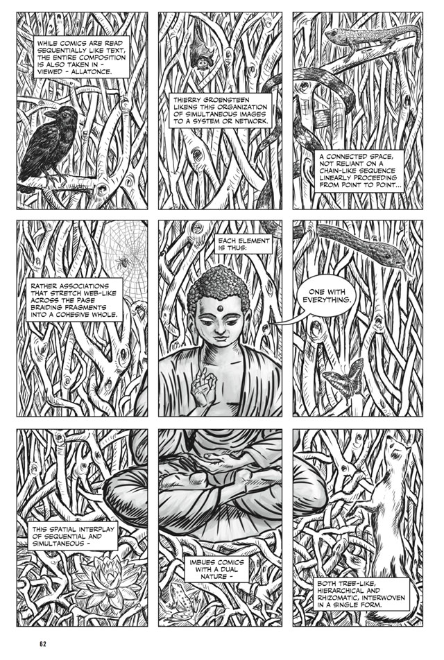 Il precursore della riflessione teorica sul medium fumetto fu, ovviamente, Will Eisner col suo imprescindibile Comics and Sequential Art del 1985. Un anno prima di Maus, Watchmen e The Dark Knight Returns, ecco un testo che finalmente trattava il fumetto come una forma artistica di assoluto rilievo, realizzato da quello che molti ritengono il padre del romanzo grafico. Tempo pochi anni, e spuntò un’altra pietra miliare che cercava di tradurre su carta tutta una serie di idee e teorie sulla nona arte: Understanding Comics di Scott McCloud. Ma McCloud, operando una scelta semplice e geniale, decise di realizzare il suo trattato che parlava di fumetti in forma di fumetto. La svolta non è banale, perché consente di dimostrare la validità dei concetti esposti nel momento stesso in cui vengono enunciati, sostenendo e dunque provando i pregi dell’arte sequenziale in un colpo solo. Un cambiamento di rotta che ha permesso a McCloud di guadagnarsi l’appellativo di “McLuhan del fumetto” e che ha, di fatto, dato i natali a tutta un’intera tradizione di “saggistica a fumetti“. Produzione in cui Nick Sousanis si inserisce di prepotenza col suo Unflattening non solo come epigono di McCloud ma addirittura in qualità di erede diretto. Infatti, in questo testo l’autore va oltre sviluppando tutta una serie di riflessioni che paiono assolutamente complementari con Understanding Comics e insieme lo rafforzano.