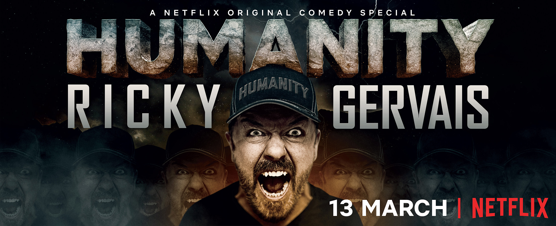 Sinossi: “Ricky Gervais inaugura il 2018 con un nuovo speciale comico di Netflix, Ricky Gervais: Humanity, filmato all’Apollo Hammersmith di Londra. Vincitore di Golden Globe ed Emmy, il comico britannico torna sul palco a Londra con uno spettacolo feroce in cui parla tra l’altro d’invecchiamento, dell’essere viziati e del suo punto di vista sull’avere figli.”