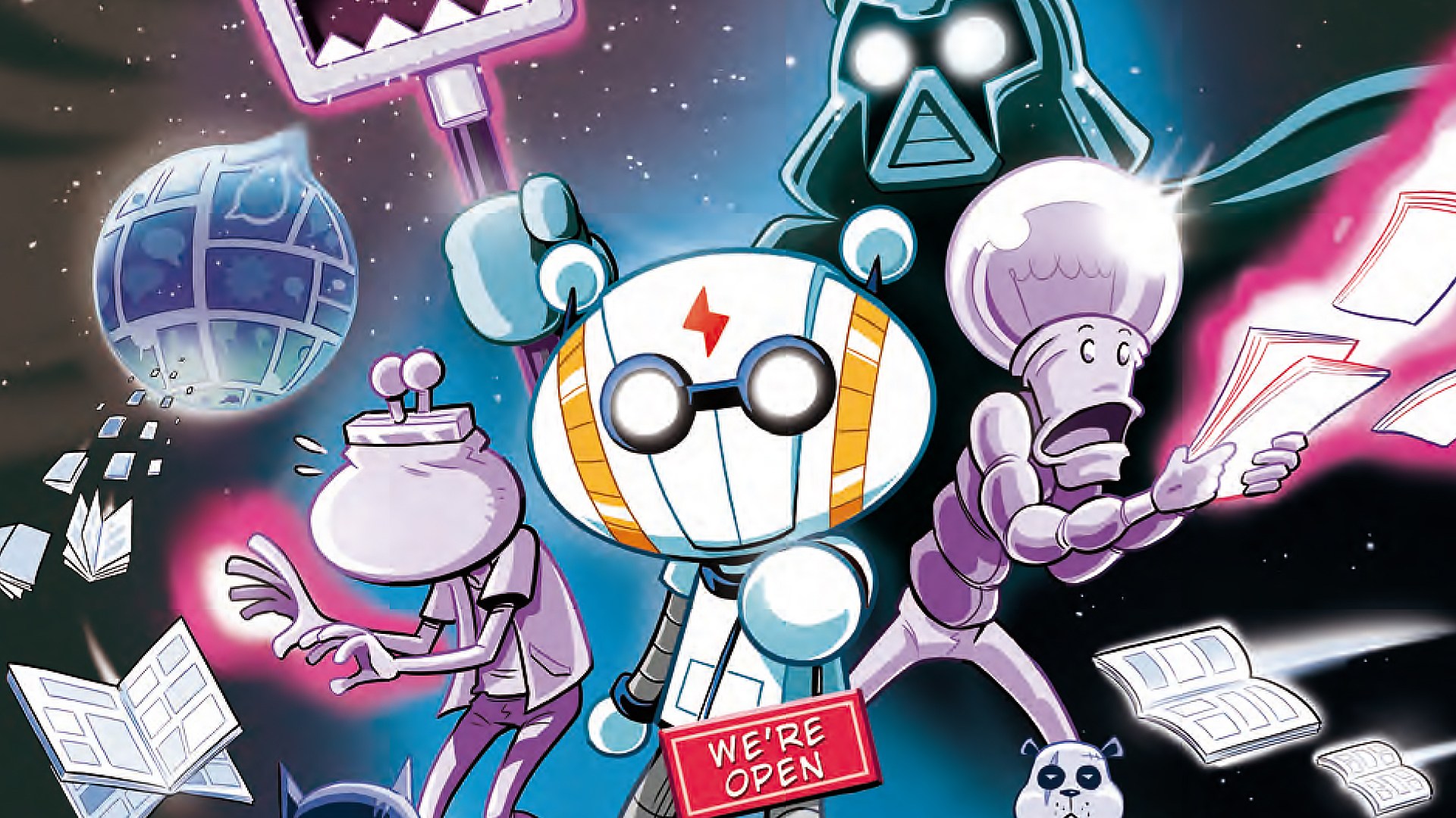 Al centro del nuovo, irresistibile numero di VOLT – CHE VITA DI MECHA – uscito venerdì 22 settembre in edicola e in fumetteria – c’è proprio questa sfida, che vede fronteggiarsi due gruppi di nerd pronti a tutto per far prevalere il loro punto di vista. Il quinto numero di VOLT s’intitola CUORE E ACCIAIO (pagg. 64, euro 2.99) e sfoggia un’immagine di copertina che rappresenta un evidente omaggio a uno dei disegnatori più amati e importanti degli ultimi anni. Cosa accade dunque, al piccolo robot che sogna di diventare fumettista? Gli capita di trovarsi al centro della battaglia: giovani e vecchi lettori si sfidano per la supremazia territoriale e per il controllo della fumetteria Comic Sans. Per decretare il gruppo vincitore, devono fare ricorso ai loro personaggi preferiti, in un caso provenienti dagli anni ‘80, nell’altro dal nuovo millennio. Una sfida esilarante che tocca tutti i generi e che vede Volt negli scomodissimi panni dell’arbitro.