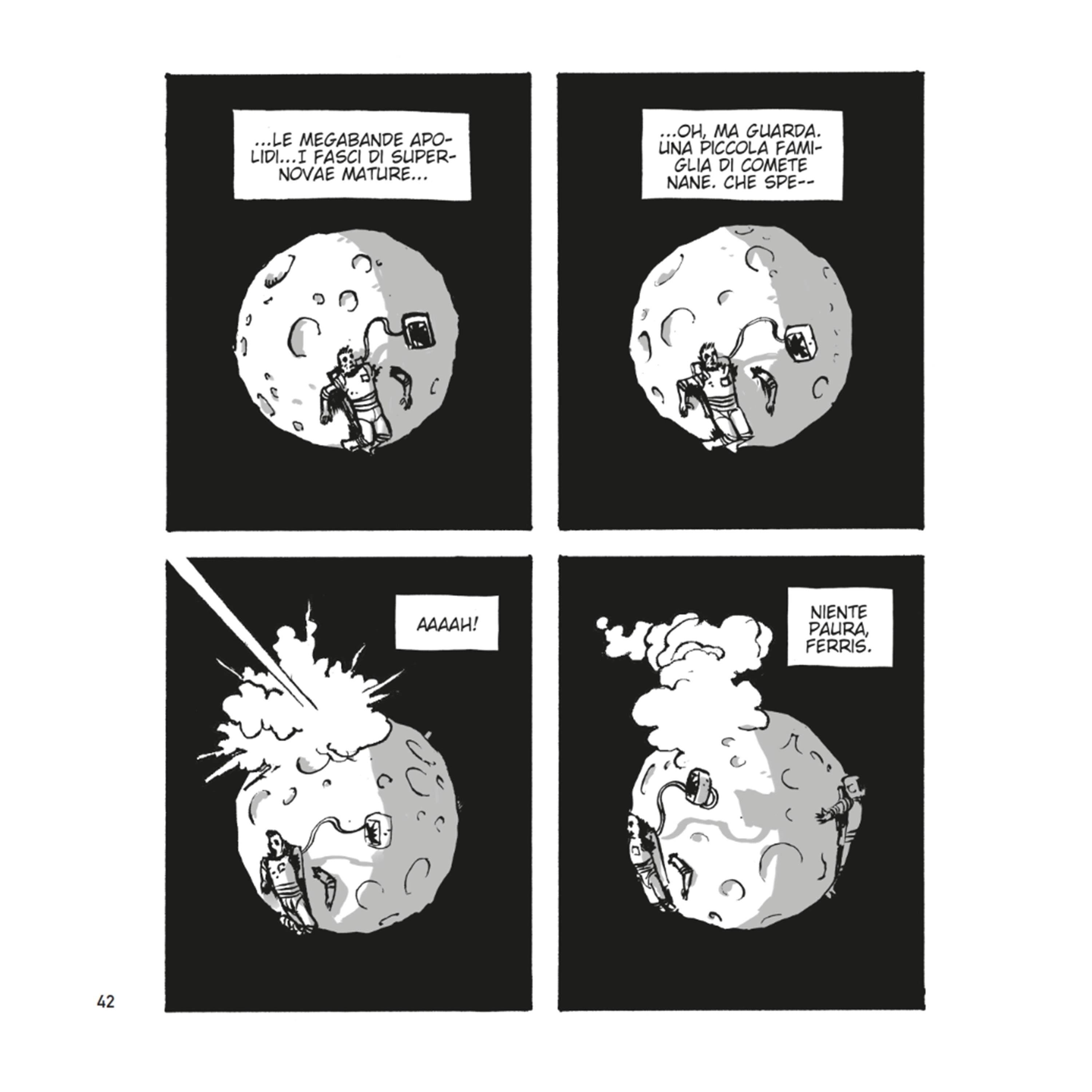 Sinossi – In un lontano e approssimativo futuro Rico Ferris, astronauta, si trova immobilizzato su una piccola luna in chissà quale galassia, in attesa di essere salvato dal suo amico Casio Malzy… che però è già morto sull’altro lato della luna. Nella mente di Rico si fanno strada visioni e deliri che lo portano a vivere avventure al confine tra follia e realtà e a scoprire la sua vera, sorprendente natura.
