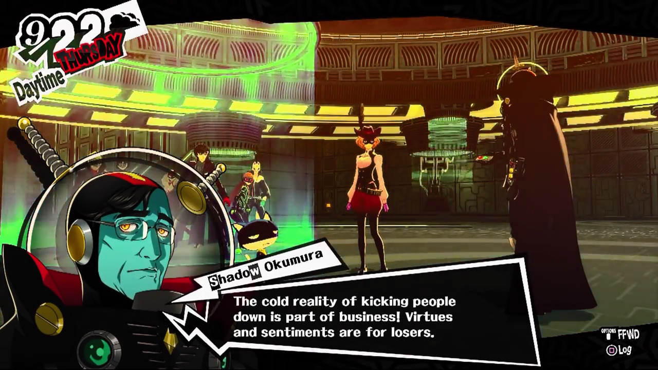 Come una distorta piramide, Persona 5 vede in questi elementi le basi della corruzione della società giapponese contemporanea, responsabili di un’escalation di nefandezze tutt’altro che immaginarie: insegnanti che abusano della propria posizione, membri della Yakuza che avvolgono i propri tentacoli sulla vita civile, Direttori di Aziende che sfruttano i lavoratori, Polizia corrotta ed infine anche ufficiali del governo che portano avanti pericolose politiche nazionaliste ed edoniste.