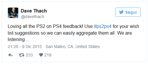 Con l’emulazione di PlayStation 2 ormai disponibile su PlayStation 4, Dave Thach di PlayStation Worldwide Studios ha lanciato su Twitter l’hashtag #ps2ps4, chiedendo agli utenti PlayStation quali giochi vorrebbero vedere emulati sull’ammiraglia di casa Sony.