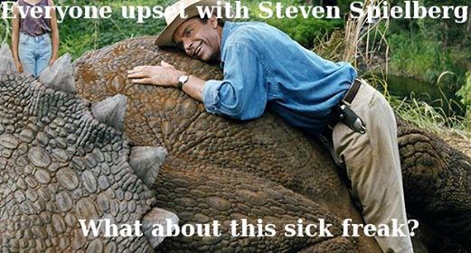 spregevole“, e da lì apriti cielo! Gli idioti della rete hanno cominciato a condividere la foto marchiando il povero Spielberg come “un mostro” o “un carnefice”, più tutta una serie di altre brutte parole che, fondamentalmente, inneggiano alla morte del povero regista, reo di “aver ucciso una creatura innocente per sport, e forse solo per tenersi le sue corna”. I numeri parlano chiaro: oltre 30000 persone hanno visualizzato il post, con un totale di oltre 6000 commenti per la sola immagine originale! A nulla è servito l’appello delle poche persone intelligenti che si sono approcciate al post, né tantomeno le voci dello stesso Branscomb, Spielberg è stato letteralmente sommerso da critiche, tweet e commenti. Alla rete, insomma, non è fregato nulla che il tutto fosse una bufala, il che, considerando anche la natura della “vittima” (povero.. innocente triceratopo…), non fa ben sperare sulla teoria dell’evoluzione di Darwin che ci vorrebbe belli alti sulla catena alimentare. Mha…