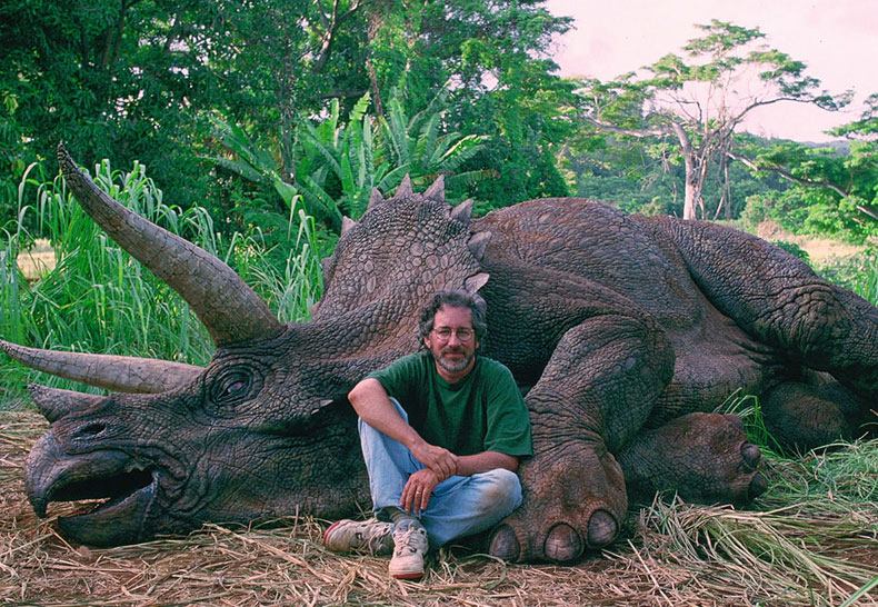 Che cosa succede? Succede che un tizio, tale James Branscomb (famoso in rete come creatore di cazzate e meme vari) ha pubblicato sulla sua pagina Facebook la celeberrima foto del 1993 di Spielberg accanto ad un triceratopo stecchito. La foto, magari non lo sapete, fu scattata ai tempi delle riprese di Jurassic Park, ed il triceratopo è, ovviamente, uno dei tanti animatronics che fu usato per il film perché… ehi, notizia del giorno! I Dinosauri sono estinti! Ora, sarà che Einstein aveva ragione, o che la gente non si ricorda che i dinosauri sono estinti o che, metti, nessuno si ricorda di aver visto Jurassic Park, fatto sta che la burla di Branscomb ha alzato un polverone.