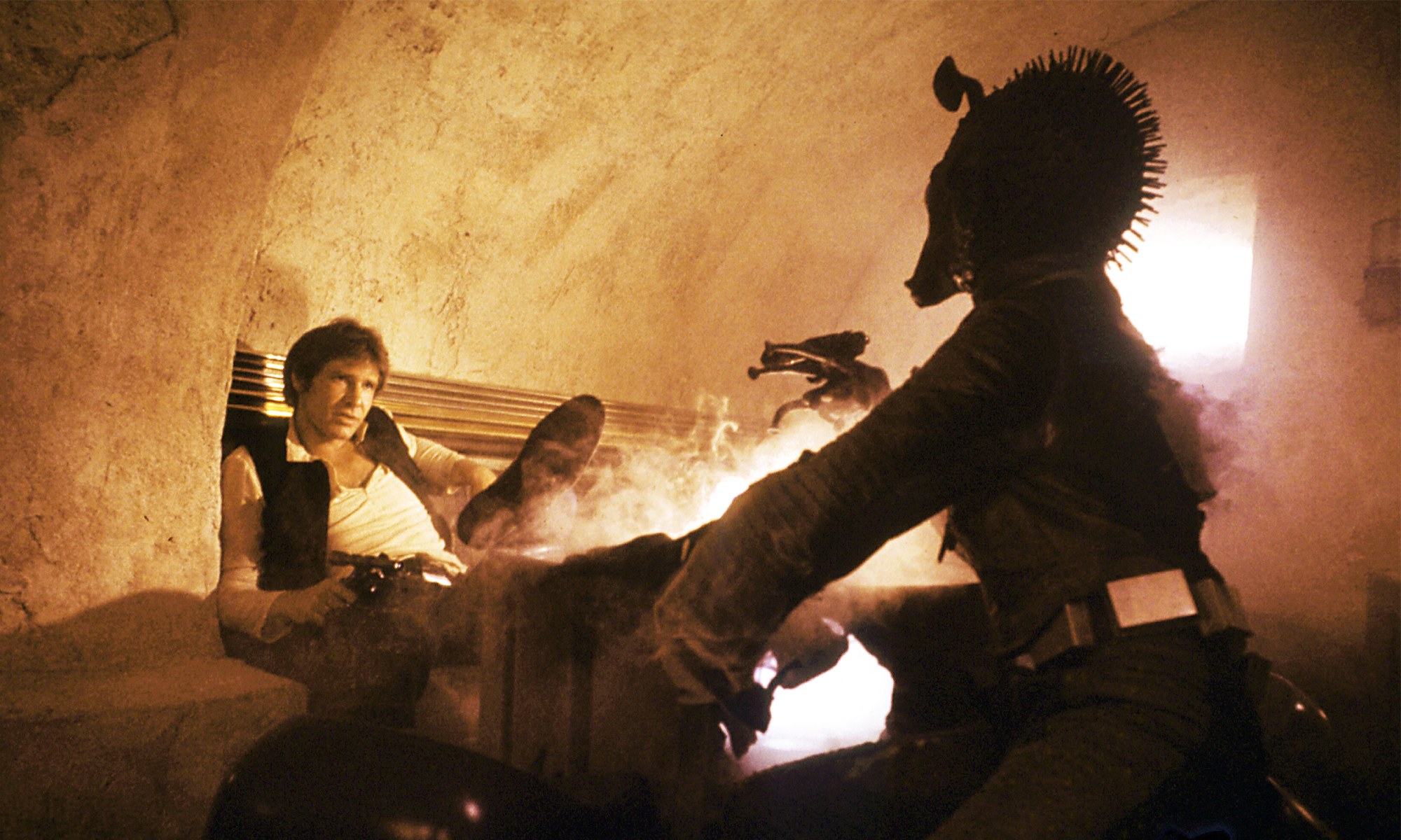 “Han shot first” è uno dei tormentoni dei fan di Star Wars, legato alla scena dove il capitano del Millennium Falcon uccide il sicario Greedo. Negli anni la sequenza ha subito un numero eccessivo di modifiche, dovute al desiderio di George Lucas di rendere meno negativo il personaggio interpretato da Harrison Ford.