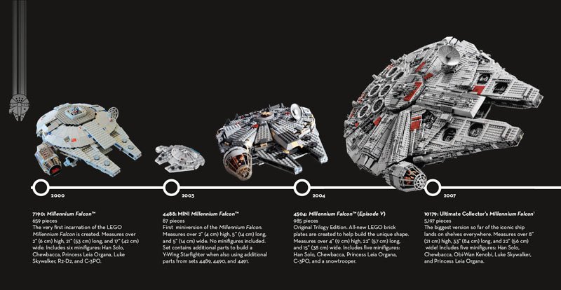“Ti presentiamo il modello più grande e più dettagliato del Millennium Falcon LEGO® Star Wars mai creato! E con 7.500 pezzi, è sicuramente uno dei modelli LEGO più grandi in assoluto! Questa fantastica interpretazione LEGO dell’indimenticabile nave da trasporto corelliana di Ian Solo ha tutti i dettagli che i fan di Star Wars di ogni età possono desiderare, tra cui intricati particolari esterni, parabole sensore intercambiabili, cannoni a quattro laser superiori e inferiori, gambe di atterraggio, rampa di imbarco abbassabile e una cabina di pilotaggio per 4 minifigure con tettuccio rimovibile. Rimuovi i pannelli individuali della fusoliera per rivelare la sezione principale, altamente dettagliata, il compartimento posteriore e la stazione di artiglieria. Questo fantastico modello è dotato di parabole sensore ed equipaggio intercambiabili per rivivere le classiche avventure LEGO Star Wars con Ian, Leia, Chewbecca e C-3PO o quelle degli Episodi VII e VIII con il vecchio Ian, Rey, Finn e BB-8!”