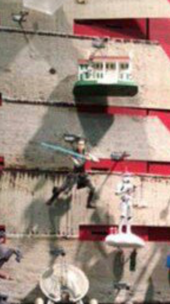 Come potete constatare da soli, nella foto generale e nel dettaglio, è chiaramente visibile una figura femminile che impugna una spada laser azzurra e, sebbene la qualità non permetta di esserne certi al 100%, l’ipotesi è che si tratti proprio di Rey e che la spada sia quella di Luke Skywalker.