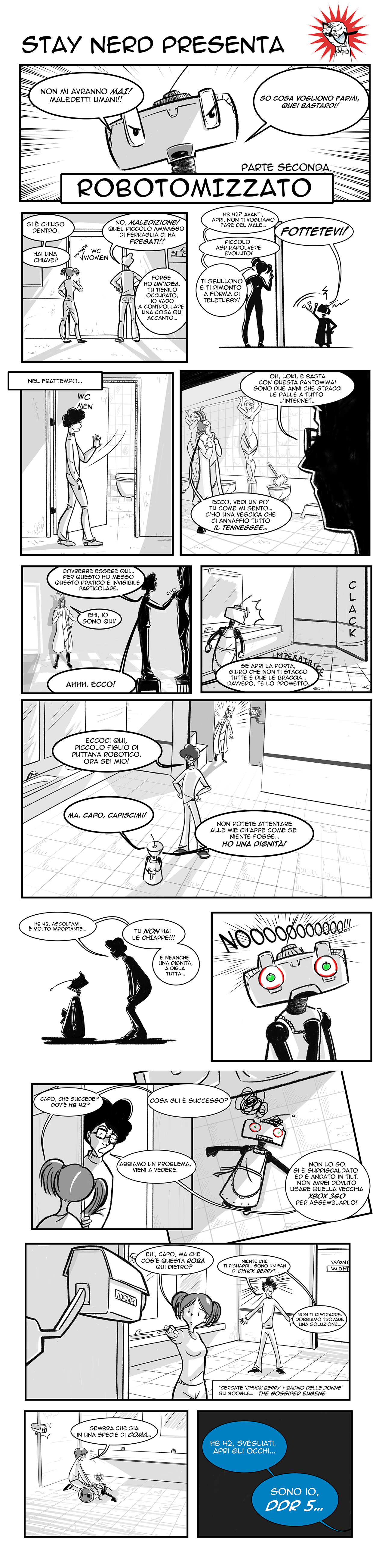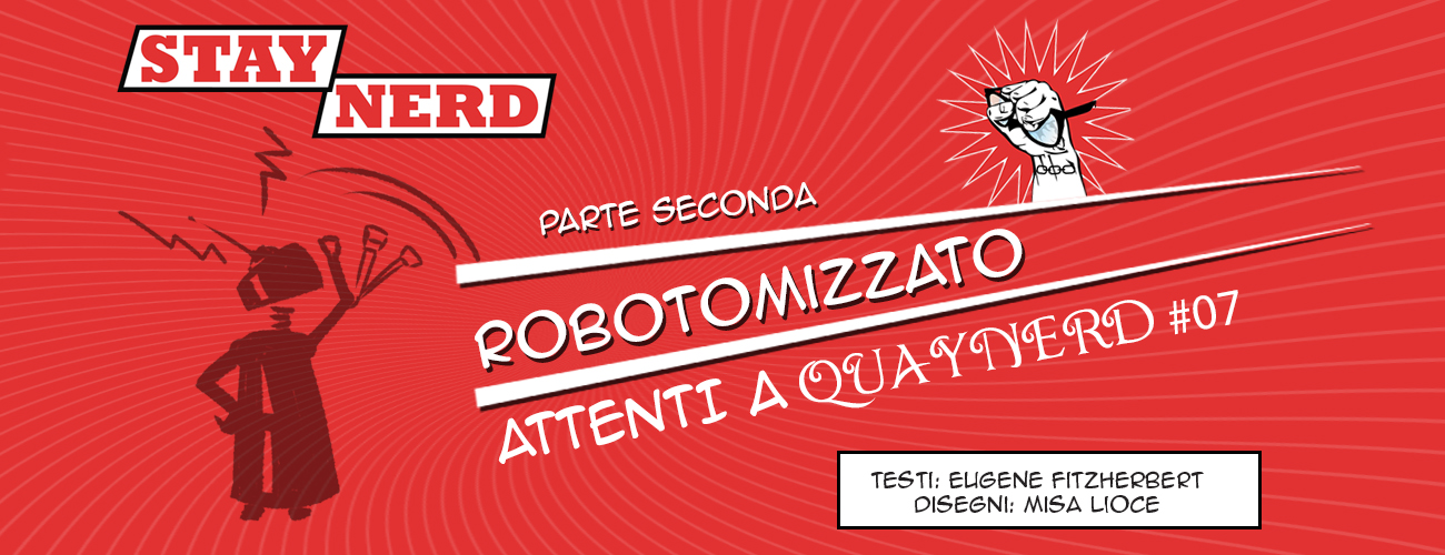 Bentornati su questi lidi (visto che è luglio e stiamo letteralmente schiattando di caldo!) con il nuovo issue di Attenti a QuayNerd. Continua la disavventura di HB 42, il nostro Maggiordroide con problemi comporta-mentali, che sta cercando di sfuggire al suo oscuro e ignoto destino. Lo troviamo chiuso nel bagno delle donne, sicuro di poterla fare franca. Ma nella redazione di QuayNerd niente è come sembra e il Capo conosce bene i segreti che si nascondono tra quelle mura. La trama si sta dipanando un po’ alla volta, e il finale lascia presagire un prossimo interludio onirico-mistico-soprannaturale-allucinato.