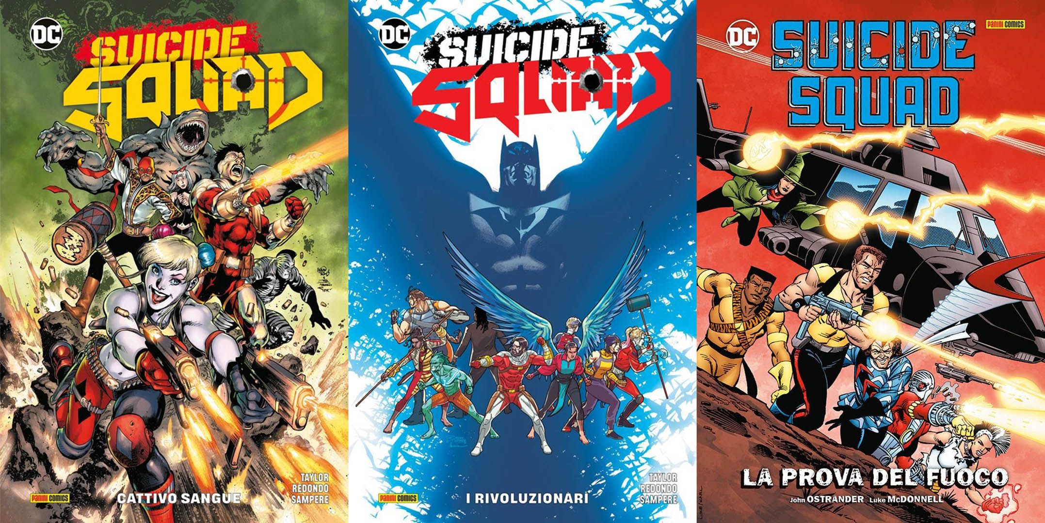 Suicide Squad vol. 1: Cattivo Sangue di Tom Taylor e Bruno Redondo, Suicide Squad vol. 2: I rivoluzionari e infine Suicide Squad: La Prova del Fuoco. I volumi saranno acquistabili in edicola e fumetteria, o prenotabili sullo store online di Panini.