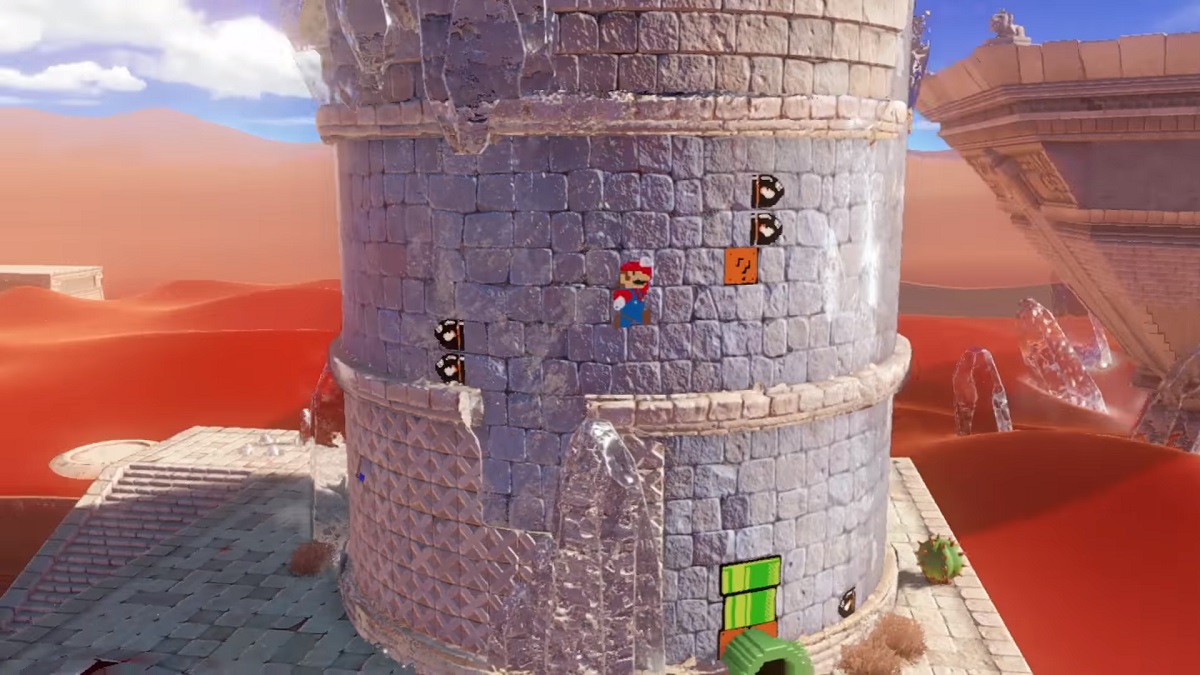 L’area Sand Kingdom sostanzialmente funziona allo stesso modo: grande mappa/hub centrale in cui si dipanano varie sfide ed accessi a livelli veri e propri. Giocando questa desertica location, cosparsa di strani grossi cristalli che spuntano dal terreno, ci siamo resi conto dell’esistenza delle monete viola che, a differenza di quelle classiche possono essere utilizzate nei negozi per comprare oggetti. Esatto, in questo Mario sono presenti dei simpatici negozietti in cui volendo possiamo cambiare abbigliamento. L’occasione era ghiotta e quindi non abbiamo potuto fare a meno di comprarci un bel sombrero anche se un po’ rammaricati dal fatto che a livello di gameplay non cambiasse sostanzialmente nulla (rimane quindi una cosa estetica). In questo livello, manco a farlo apposta, i maggiori sorrisi me li hanno strappati le solite fantastiche genialate che solo Miyamoto al giorno d’oggi riesce a concepire. Per salire sul tetto di un edificio di pietra, siamo entrati in un tubo che ci ha letteralmente “spalmato” sulla parete esterna, in cui era riprodotto un livello 2d con i classici sprite di Super Mario Bros. Un livello quindi da portare a termine per raggiungere senza soluzione dicontinuità e attraverso un altro tubo, il tetto del palazzo. In un altro frengente mentre saltavamo da una piattaforma all’altra per raggiungere una luna, ci siamo accorti di come effettivamente la dinamica del cappello possa in qualche modo cambiare le carte in tavola e vada considerata per giocare Mario Odyssey in maniera differente rispetto al passato.