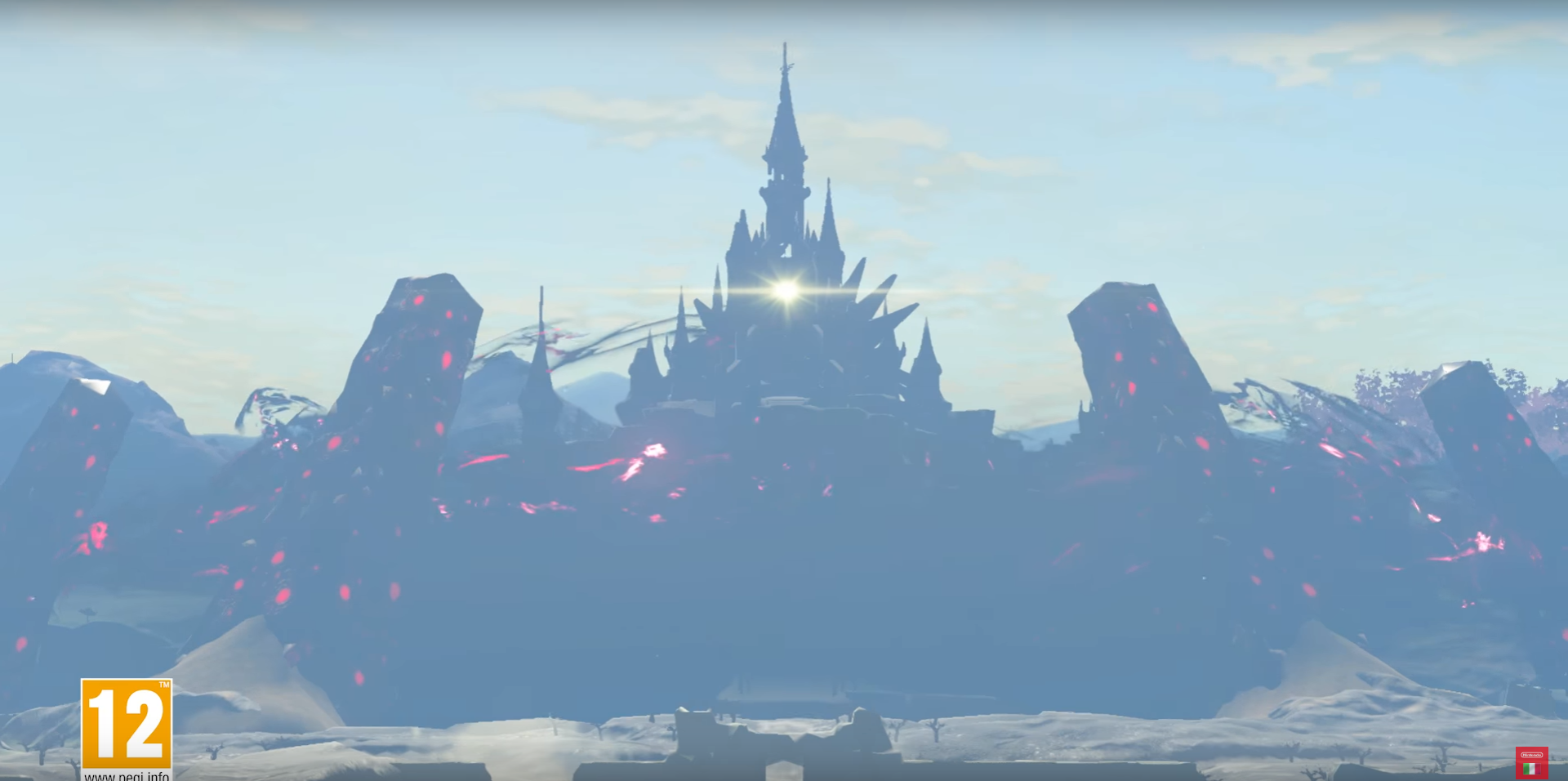 Questo è chiaramente il Castello d Hyrule corrotto da Calamity Ganon ed è interessante notare i quattro pilastri che lo circondano. Questi potrebbero in qualche modo essere legati ad altrettante creature sparse nel mondo di gioco che contribuiscono a diffondere la corruzione nelle terre di Hyrule. Boss che verosimilmente saremo chiamati a sconfiggere per bonificare le varie aree. E’ chiaro inoltre dal filmato come questa forza maligna non solo controlli vari artefatti meccanici ma anche creature viventi.