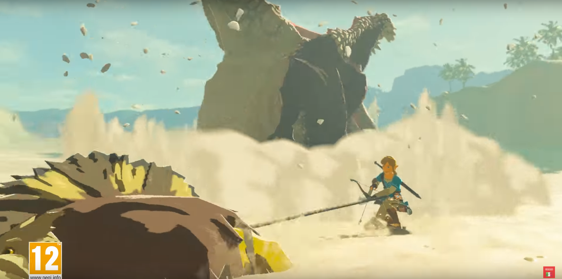 E’ evidente come Breath of the Wild sarà composto da aree estremamente diverse tra loro, passeremo quindi da zone tropicali a desertiche o addirittura innevate. Non una grande scoperta di per sé se non fosse che il trailer ci tiene a sottolineare come ogni luogo abbia le sue razze di animali peculiari. Non c’è dato sapere fino a che punto saranno solo un elemento estetico per render vivi e vibranti i paesaggi e quanto invece questi animali si presteranno a delle dinamiche del gioco. Possiamo però notare un particolare nell’area desertica. Una specie di “Tricheco da sabbia” e come vedremo in seguito nel trailer, questa razza avrà sicuramente un ruolo nel gameplay del gioco.