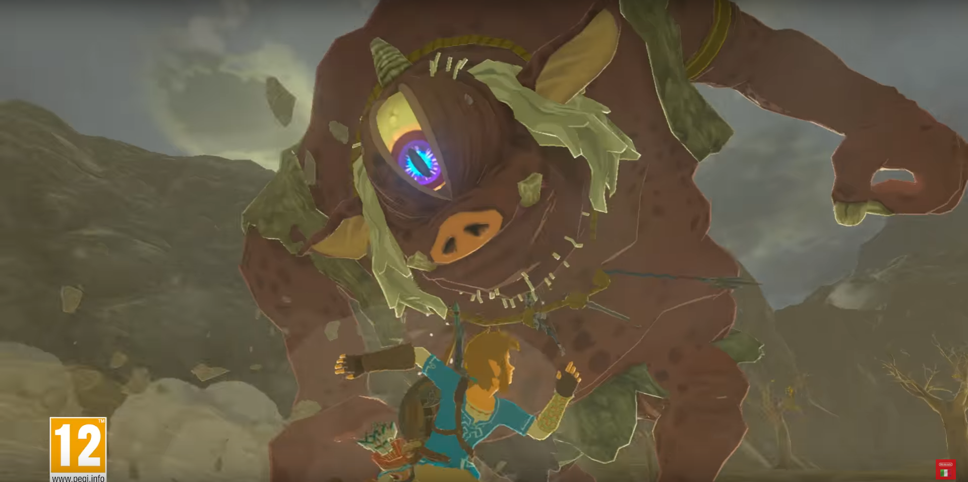 In BOTW non mancheranno le creature giganti da combattere, questo appare evidente a più riprese, anche in questo stesso trailer. Ma soffermiamoci un attimo su questo enorme specie di Moblin. Possiamo notare un grosso occhio dai colori molto vividi, che come da tradizione evidenzieranno un punto debole da colpire, e una cosa forse ancora più interessante. Notate quelle armi intorno al collo, utilizzate come se fossero le decorazioni di una collana? Non sarebbe male impossessarsi di esse una volta abbattuto il nemico. Di certo si tratterebbe di uno stratagemma davvero intrigante per farci ottenere armi uniche.